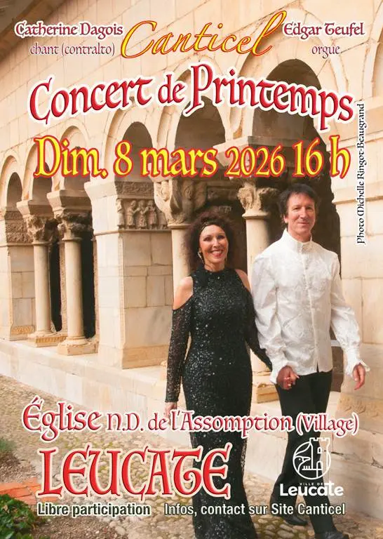 Am Sonntag, den 17. März, um 16 Uhr kehren die beiden Künstler aus Canticel zurück, um in der wunderschönen Kirche Notre-Dame de l'Assomption im Dorf Leucate ihre Frühlingstournee zu eröffnen, um die Ankunft des Frühlings in der Musik zu feiern.
